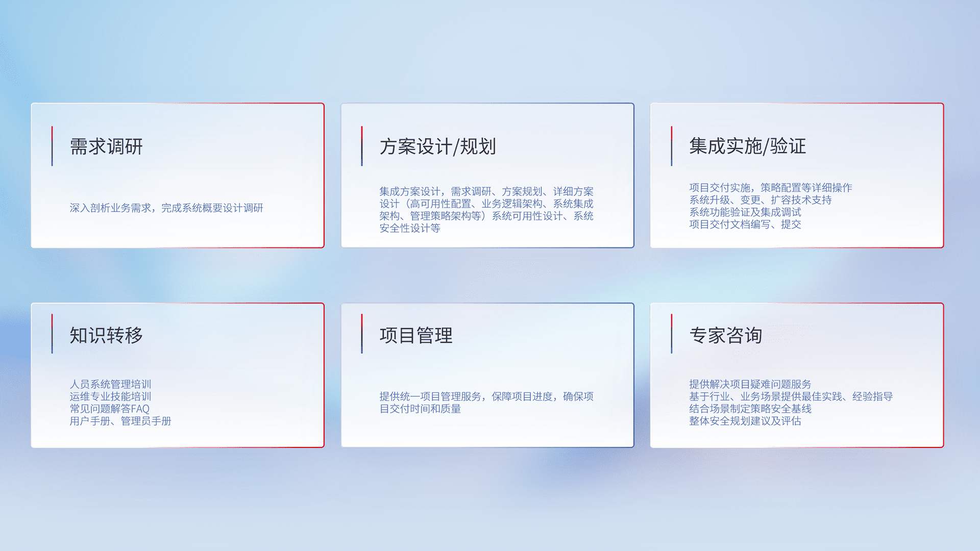 针对客户行业特性,,,,将宏观的安全战略和需求,,通过专业的交付服务,,实现项目落地,,,,为客户提供标准规范的集成交付服务。。